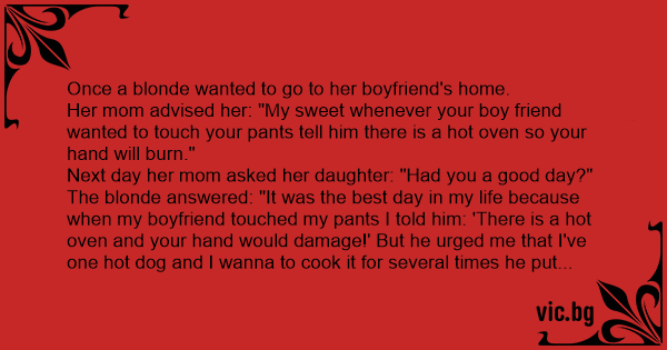 The blonde answered: "It was the best day in my life because when my boyfriend touched my pants I told him: 'There is a hot oven and your hand would damage!' But he urged me that I've one hot dog and I wanna to cook it for several times he put his hot dog in my pants and then he put it in my mouth for confident whether it has been cooked or not."