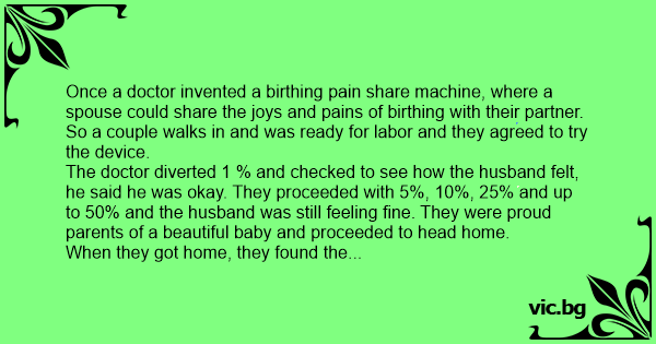 Once a doctor invented a birthing pain share machine, where a spouse could share the joys and pains of birthing with their partner. So a couple walks in and was ready for labor and they agreed to try the device.