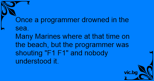 Una vez un programador se ahogó en el mar. Muchos marineros estuvieron en ese momento en la playa, pero el programador estuvo gritando: F1, F1y nadie le entendió.
