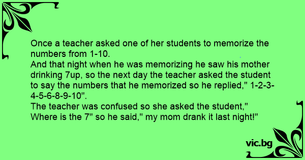 And that night when he was memorizing he saw his mother drinking 7up, so the next day the teacher asked the student to say the numbers that he memorized so he replied," 1-2-3-4-5-6-8-9-10".