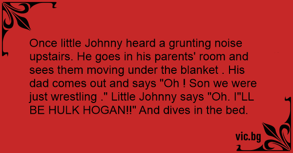 Once little Johnny heard a grunting noise upstairs. He goes in his parents' room and sees them moving under the blanket . His dad comes out and says "Oh ! Son we were just wrestling ." Little Johnny says "Oh. I"LL BE HULK HOGAN!!" And dives in the bed.