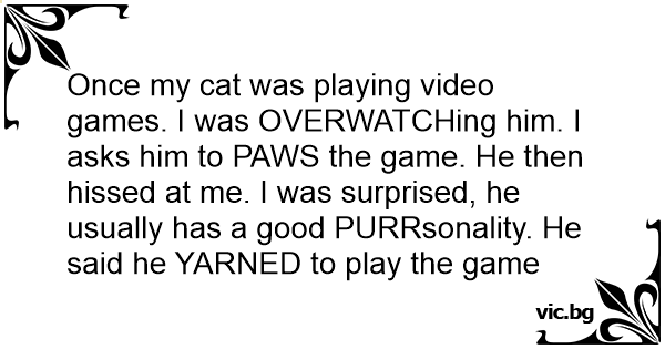 Once my cat was playing video games. I was OVERWATCHing him. I asks him to PAWS the game. He then hissed at me. I was surprised, he usually has a good PURRsonality. He said he YARNED to play the game