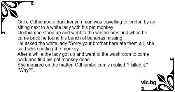 Once Odhiambo a dark kenyan man was travelling to london by air sitting next to a white lady with his pet monkey.