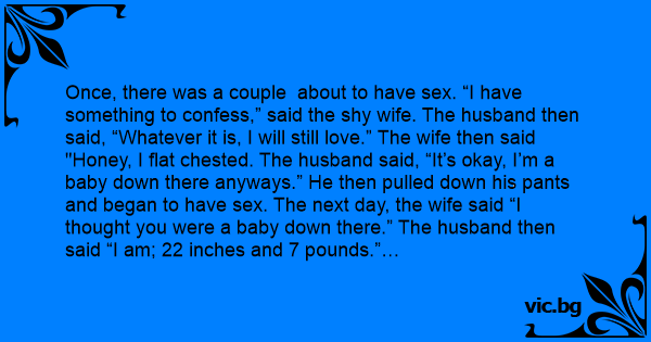 Once, there was a couple about to have sеx. “I have something to confess,” said the shy wife. The husband then said, “Whatever it is, I will still love.” The wife then said "Honey, I flat chested. The husband said, “It’s okay, I’m a baby down there anyways.” He then pulled down his pants and began to have sеx. The next day, the wife said “I thought you were a baby down there.” The husband then said “I am; 22 inches and 7 pounds.”…