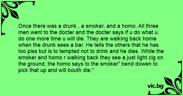 Once there was a drunк , a smoker, and a hомо. All three men went to the docter and the docter says if u do what u do one more time u will die. They are walking back home when the drunк sees a bar. He tells the others that he has too рiss but is to tempted not to drink and he dies. While the smoker and hомо r walking back they see a just light cig on the ground, the hомо says to the smoker" bend dowen to pick that up and will bouth die."