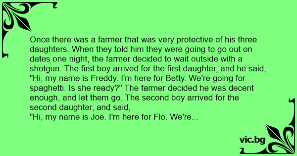 "Hi, my name is Freddy. I'm here for Betty. We're going for spaghetti. Is she ready?" The farmer decided he was decent enough, and let them go. The second boy arrived for the second daughter, and said,