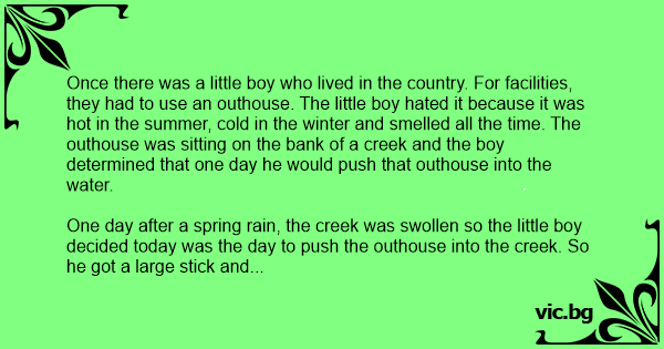 Once there was a little boy who lived in the country. For facilities, they had to use an outhouse. The little boy hated it because it was hot in the summer, cold in the winter and smelled all the time. The outhouse was sitting on the bank of a creek and the boy determined that one day he would push that outhouse into the water.