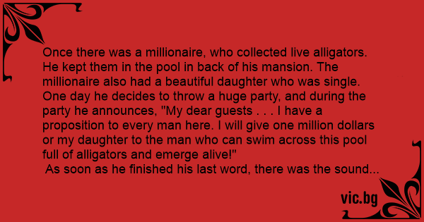 Once there was a millionaire, who collected live alligators. He kept them in the pool in back of his mansion. The millionaire also had a beautiful daughter who was single. One day he decides to throw a huge party, and during the party he announces, "My dear guests . . . I have a proposition to every man here. I will give one million dollars or my daughter to the man who can swim across this pool full of alligators and emerge alive!"
