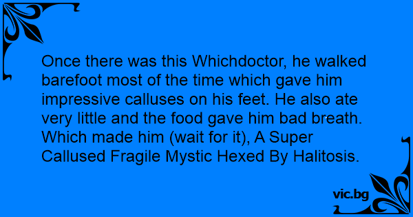 Once there was this Whichdoctor, he walked barefoot most of the time which gave him impressive calluses on his feet. He also ate very little and the food gave him bad breath. Which made him (wait for it), A Super Callused Fragile Mystic Hexed By Halitosis.