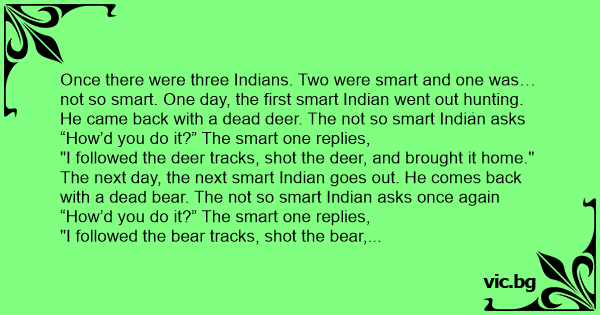 Once there were three Indians. Two were smart and one was… not so smart. One day, the first smart Indian went out hunting. He came back with a dead deer. The not so smart Indian asks “How’d you do it?” The smart one replies,