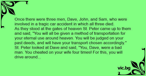 Drie mannen staan bij de hemelpoort waarop op Petrus zegt: "Nu gaan we bekijken wat voor vervoer jullie zo krijgen..." "We doen het zo: Hoe vaker je bent vreemd gegaan hoe slechter het vervoer." De...