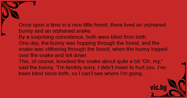 This, of course, knocked the snake about quite a bit.”Oh, my,” said the bunny, “I’m terribly sorry. I didn’t mean to hurt you. I’ve been blind since birth, so I can’t see where I’m going. In fact, since I’m also an orphan, I don’t even know what I am.”