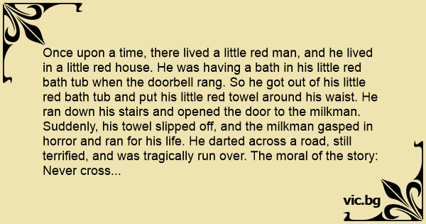 Once upon a time, there lived a little red man, and he lived in a little red house. He was having a bath in his little red bath tub when the doorbell rang. So he got out of his little red bath tub and put his little red towel around his waist. He ran down his stairs and opened the door to the milkman. Suddenly, his towel slipped off, and the milkman gasped in horror and ran for his life. He darted across a road, still terrified, and was tragically run over. The moral of the story: Never cross the road when the little red man is flashing!