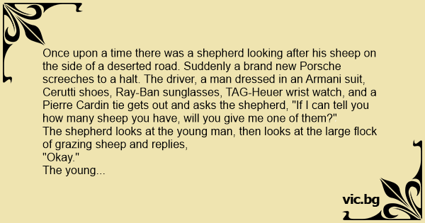 Once upon a time there was a shepherd looking after his sheep on the side of a deserted road. Suddenly a brand new Porsche screeches to a halt. The driver, a man dressed in an Armani suit, Cerutti shoes, Ray-Ban sunglasses, TAG-Heuer wrist watch, and a Pierre Cardin tie gets out and asks the shepherd, "If I can tell you how many sheep you have, will you give me one of them?"