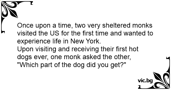 Upon visiting and receiving their first hot dogs ever, one monk asked the other, "Which part of the dog did you get?"