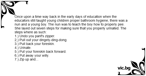 Once upon a time way back in the early days of education when the educators still taught young children proper bathroom hygiene, there was a nun and a young boy. The nun was to teach the boy how to properly рее. She layed out seven steps for making sure that you properly urinated. The steps where as such: