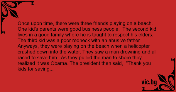 Anyways, they were playing on the beach when a helicopter crashed down into the water. They saw a man drowning and all raced to save him. As they pulled the man to shore they realized it was Obama. The president then said, "Thank you kids for saving me! I'll give you each one wish!" The first kid said he wanted a helicopter. The second kid wished for some money. And the redneck asked for a wheel chair. Obama, concerned, asked why the poor boy wouldn't want some money for his family. The kid replied, "'Cause when pap finds out what I've done, I ain't gonna be walking for a pretty long time."