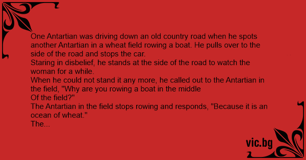 One Antartian was driving down an old country road when he spots another Antartian in a wheat field rowing a boat. He pulls over to the side of the road and stops the car.