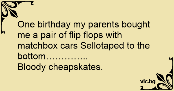One birthday my parents bought me a pair of flip flops with matchbox cars Sellotaped to the bottom…………..