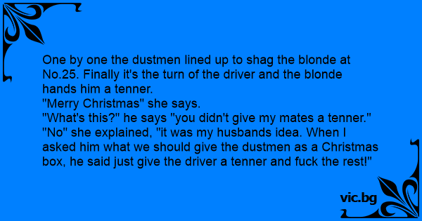 "No" she explained, "it was my husbands idea. When I asked him what we should give the dustmen as a Christmas box, he said just give the driver a tenner and fuск the rest!"