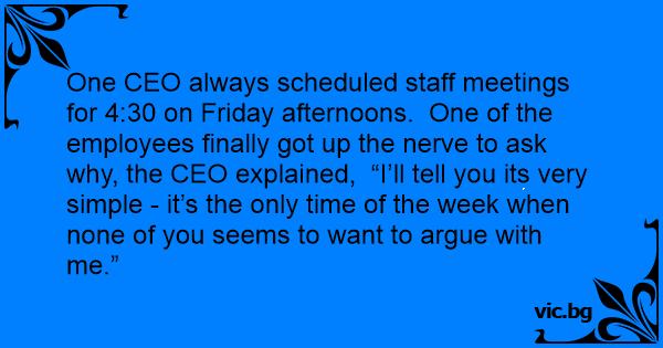One CEO always scheduled staff meetings for 4:30 on Friday afternoons. One of the employees finally got up the nerve to ask why, the CEO explained, “I’ll tell you its very simple - it’s the only time of the week when none of you seems to want to argue with me.”