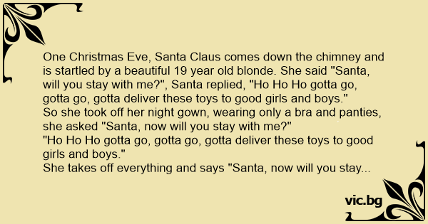 One Christmas Eve, Santa Claus comes down the chimney and is startled by a beautiful 19 year old blonde. She said "Santa, will you stay with me?", Santa replied, "Но Но Но gotta go, gotta go, gotta deliver these toys to good girls and boys."