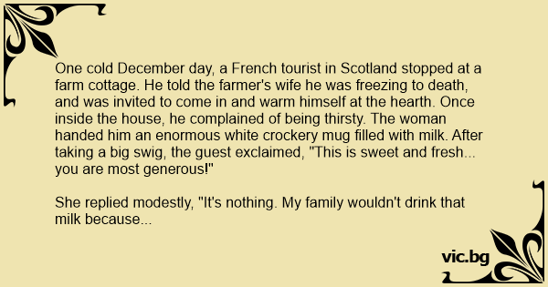 One cold December day, a French tourist in Scotland stopped at a farm cottage. He told the farmer's wife he was freezing to death, and was invited to come in and warm himself at the hearth. Once inside the house, he complained of being thirsty. The woman handed him an enormous white crockery mug filled with milk. After taking a big swig, the guest exclaimed, "This is sweet and fresh... you are most generous!"