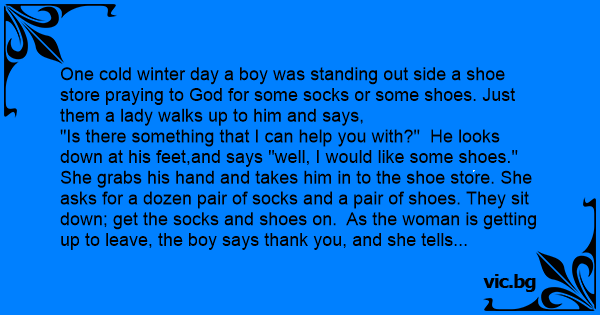 One cold winter day a boy was standing out side a shoe store praying to God for some socks or some shoes. Just them a lady walks up to him and says,