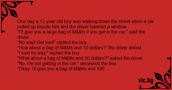 One day a 12-year-old boy was walking down the street when a car pulled up beside him and the driver lowered a window.