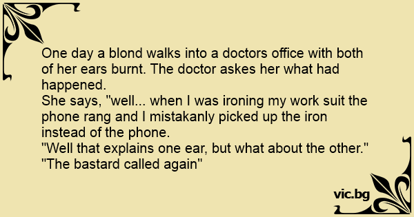 Две блондинки: - Муцка, защо са ти превързани и двете уши? - Оооф, вчера взех да гладя. Звъни ми телефона през това време... - И ти кво? - Вместо телефонът допрях ютията до ухото си... - Добре де,...