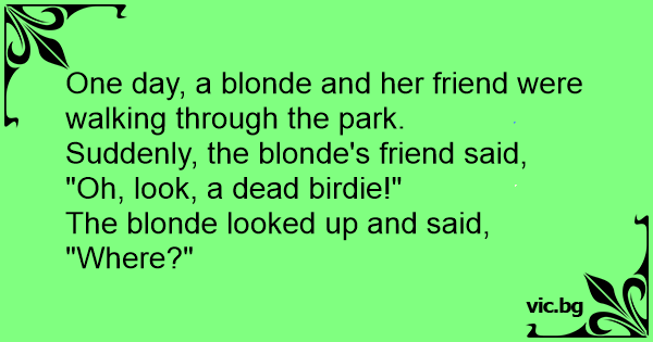 En blondine og en brunette går en tur i parken. Pludselig siger brunetten: Ad! Prøv at se på den døde fugl! – Blondinen stopper, kigger op og siger: Hvor?