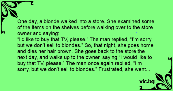 “I would like to buy that TV.” The owner of the store replied in a slightly amused voice, “I’m sorry, but we don’t sell to blondes.” At the end of her limit, the blonde cut all of her hair off, went to the store, and said, “I’d like to buy that TV.” The man said, “We don’t sell to blondes.” The blonde, extremely frustrated, said, “How do you even know I’m a blonde?!” The man replied, in a calm voice: