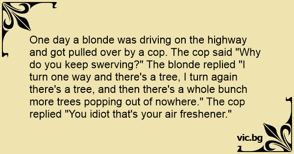 One day a blonde was driving on the highway and got pulled over by a cop. The cop said "Why do you keep swerving?" The blonde replied "I turn one way and there's a tree, I turn again there's a tree, and then there's a whole bunch more trees popping out of nowhere." The cop replied "You idiот that's your air freshener."