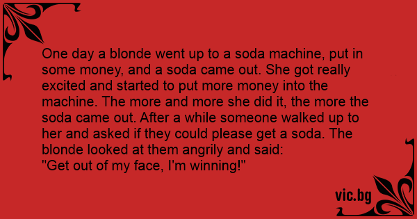 One day a blonde went up to a soda machine, put in some money, and a soda came out. She got really excited and started to put more money into the machine. The more and more she did it, the more the soda came out. After a while someone walked up to her and asked if they could please get a soda. The blonde looked at them angrily and said: "Get out of my face, I'm winning!"