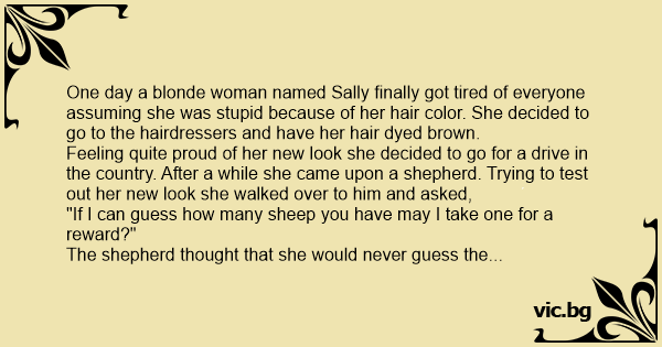 A blonde got tired of everyone treating her like she was dumb so she decided to dye her hair brown. She went out and about in the world to prove that she was smart. She came upon a sheep farmer and...
