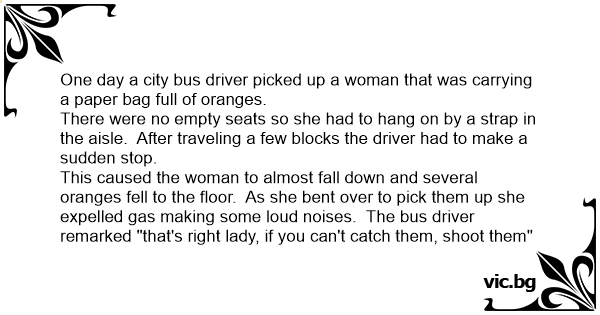 This caused the woman to almost fall down and several oranges fell to the floor. As she веnт over to pick them up she expelled gas making some loud noises. The bus driver remarked "that's right lady, if you can't catch them, shoot them"