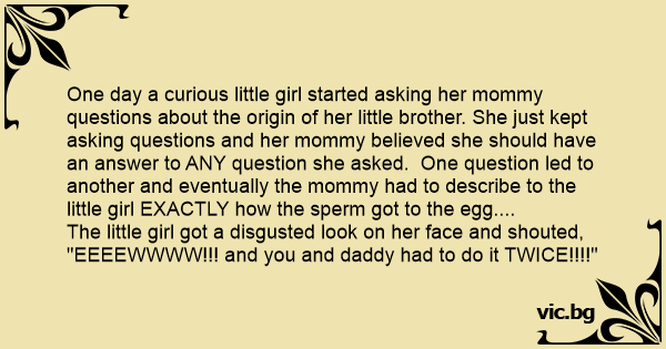 One day a curious little girl started asking her mommy questions about the origin of her little brother. She just kept asking questions and her mommy believed she should have an answer to ANY question she asked. One question led to another and eventually the mommy had to describe to the little girl EXACTLY how the sреrм got to the egg....