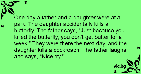 One day a father and a daughter were at a park. The daughter accidentally kills a butterfly. The father says, “Just because you killed the butterfly, you don’t get butter for a week.” They were there the next day, and the daughter kills a cockroach. The father laughs and says, “Nice try.”