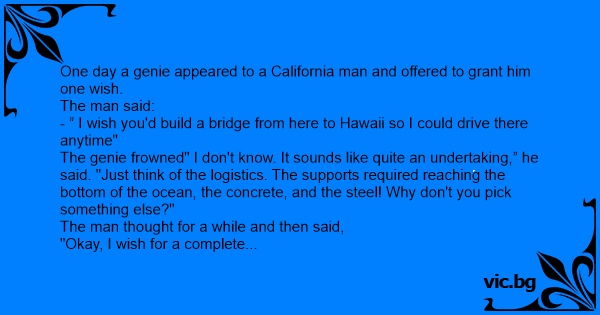 The genie was silent for a minute, then said "So how many lanes did you want on that bridge?"