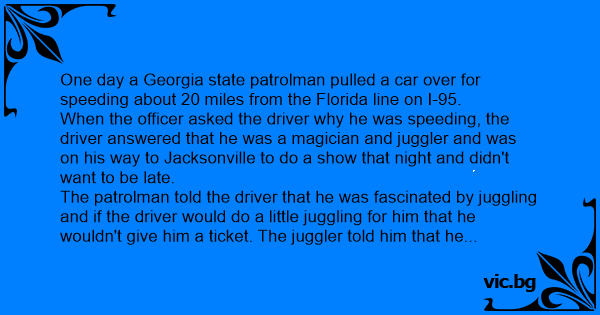 When the officer asked the driver why he was speeding, the driver answered that he was a magician and juggler and was on his way to Jacksonville to do a show that night and didn't want to be late.