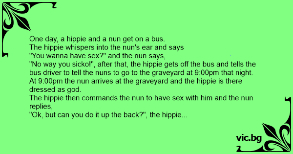 Sex med nonnen En hippie stiger ind i en bus og sætter sig ved siden af en nonne på det forreste sæde. Hippien ser på nonnen og spørger, om hun vil i seng med ham. Nonnen, der er overrasket over...