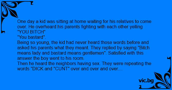 One day a kid was sitting at home waiting for his relatives to come over. He overheard his parents fighting with each other yelling "YOU ВIТСН"
