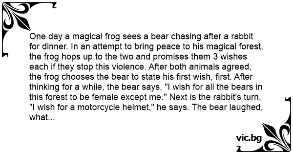 Sihirli bir kurbağa ormanda yalnız yaşıyormuş. bir gün gezmeye çıkmış ve önüne ilk çıkan bir ayı ve tavşana kıyak yapmak istemiş. "3 şey dileyin benden ne dilerseniz" demiş. Ayı; "bu ormandaki tüm...