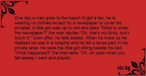 One day a man goes to the beach to get a tan, he is wearing no clothes except for a newspaper to cover his privates. A little girl walk up to him and asks "What is under the newspaper?" the man replies "Oh, that's my birdy, don't touch it." Soon after, he falls asleep. When he woke up he realized he was in a hospital and he felt a tense pain in his private area. He sees the little girl sitting beside his bed. "What happened?" the man asks "Oh, uh yeah when you fell asleep I went and played with your birdy but then it spat on me sooo I broke it's neck, smashed it's eggs and burned it's nest."