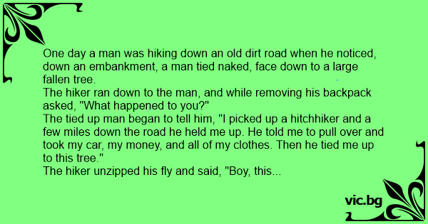 One day a man was hiking down an old dirt road when he noticed, down an embankment, a man tied nакеd, face down to a large fallen tree.