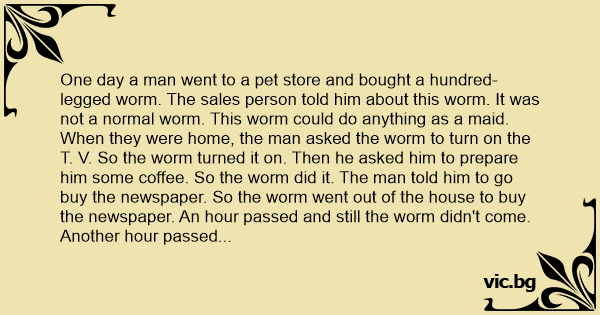 One day a man went to a pet store and bought a hundred-legged worm. The sales person told him about this worm. It was not a normal worm. This worm could do anything as a maid. When they were home, the man asked the worm to turn on the T. V. So the worm turned it on. Then he asked him to prepare him some coffee. So the worm did it. The man told him to go buy the newspaper. So the worm went out of the house to buy the newspaper. An hour passed and still the worm didn't come. Another hour passed and the worm had still not come back. So finally the man stood up and opened the front door.