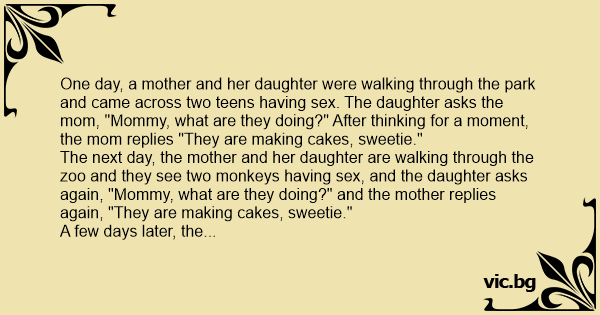 One day, a mother and her daughter were walking through the park and came across two teens having sеx. The daughter asks the mom, "Mommy, what are they doing?" After thinking for a moment, the mom replies "They are making cakes, sweetie."