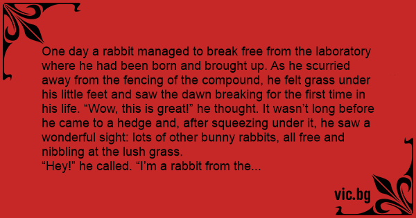 One day a rabbit managed to break free from the laboratory where he had been born and brought up. As he scurried away from the fencing of the compound, he felt grass under his little feet and saw the dawn breaking for the first time in his life. “Wow, this is great!” he thought. It wasn’t long before he came to a hedge and, after squeezing under it, he saw a wonderful sight: lots of other bunny rabbits, all free and nibbling at the lush grass.
