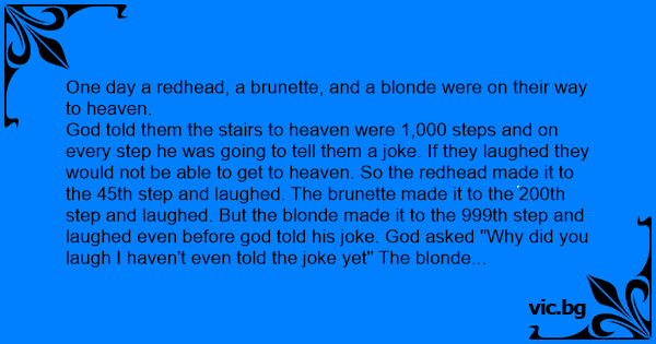 God told them the stairs to heaven were 1,000 steps and on every step he was going to tell them a joke. If they laughed they would not be able to get to heaven. So the redhead made it to the 45th step and laughed. The brunette made it to the 200th step and laughed. But the blonde made it to the 999th step and laughed even before god told his joke. God asked "Why did you laugh I haven't even told the joke yet" The blonde said "Hahaha I just got the first one!!!"