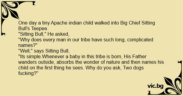 "Its simple.Whenever a baby in this tribe is born, His Father wanders outside, absorbs the wonder of nature and then names his child on the first thing he sees. Why do you ask, Two dogs fuскing?"